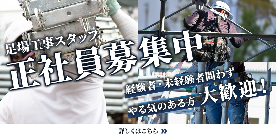 業歴30年の代表のもと、人材育成にも力を入れてきました。確かな技術と責任感を持った鳶工事職人が、現場ごとに最適な足場を組み上げます。